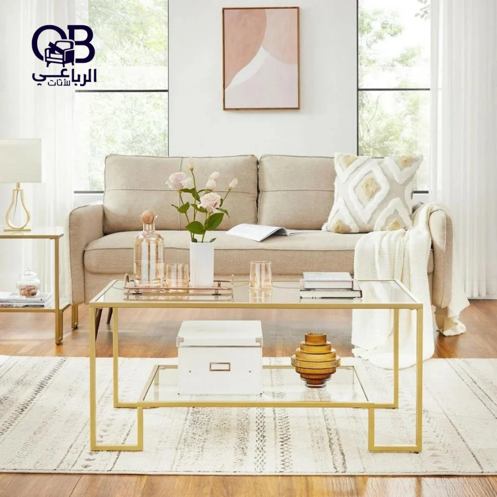 لا تفوت فرصة الحصول على طاولة وسط مودرن برفين زجاج عالية الجودة! زورنا في الرباعي للأثاث واطلب طاولتك اليوم.