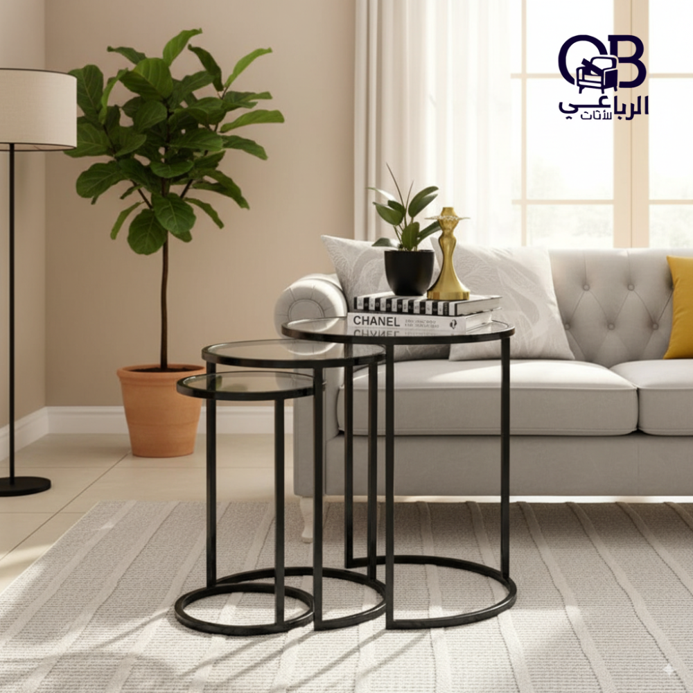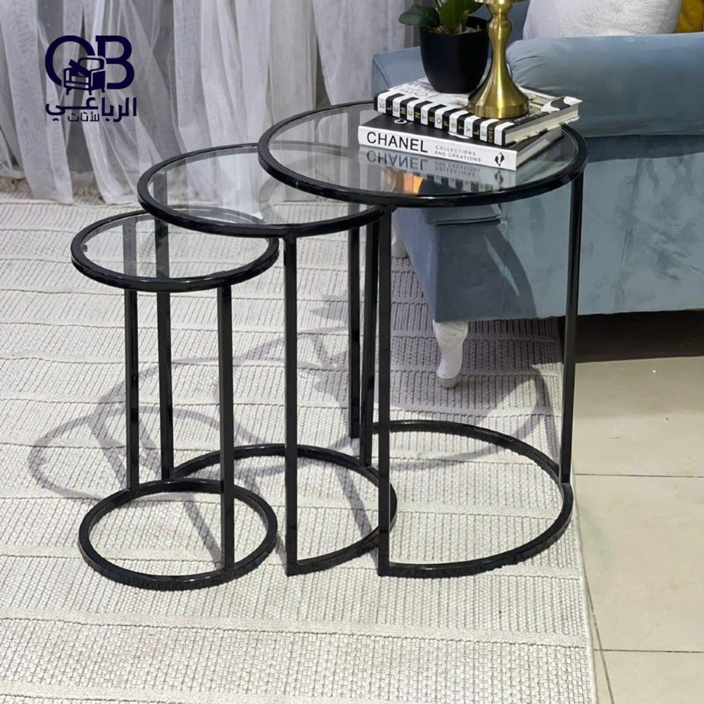 طقم طاولات خدمة 3 قطع مصمم خصيصًا لغرف المعيشة، يتضمن طاولات دائرية عصريّة مع جزء علوي من الزجاج وقاعدة معدنية سوداء متداخلة. تصميم مميز يضيف لمسة جمالية وعملية لأي مساحة داخلية.