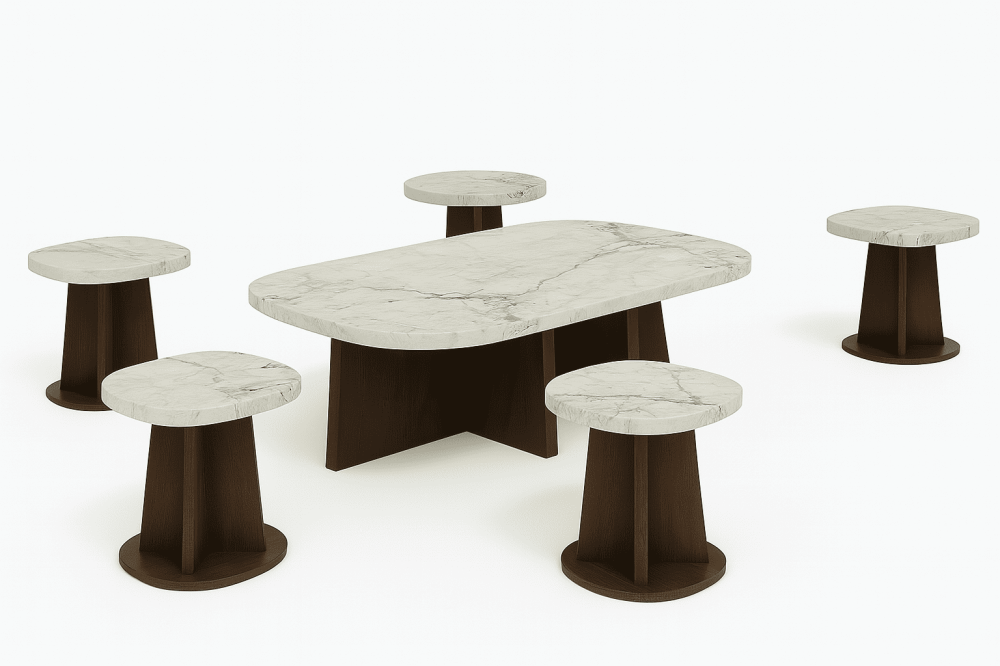 - اسم المنتج: طقم طاولات ضيافة ارضي خشب مع سطح بديل رخام أبيض 5 قطع - بتصميم فاخر