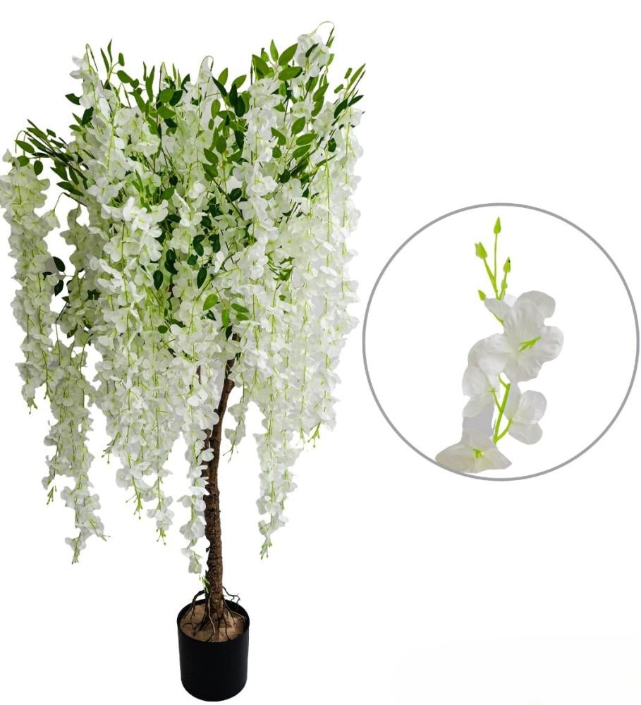 - أزهارها تتدلّى بشكل عنقودي ناعم، بلون أبيض سكري.